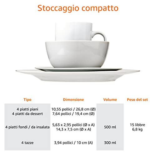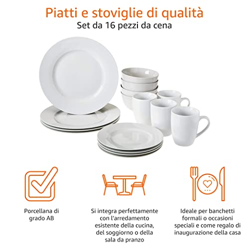 Amazon Basics Set di Stoviglie per 4 Persone, Porcellana, Bianco, 16 Pezzi