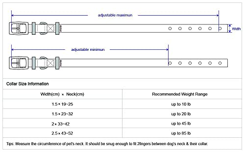Tutte le immagini mostrano i nostri campioni di produzione, larghi 2 cm per colli da 33-42 cm. Si prega di misurare i propri animali accuratamente prima di acquistare. Consultare sempre la tabella delle misure prima di scegliere la taglia.