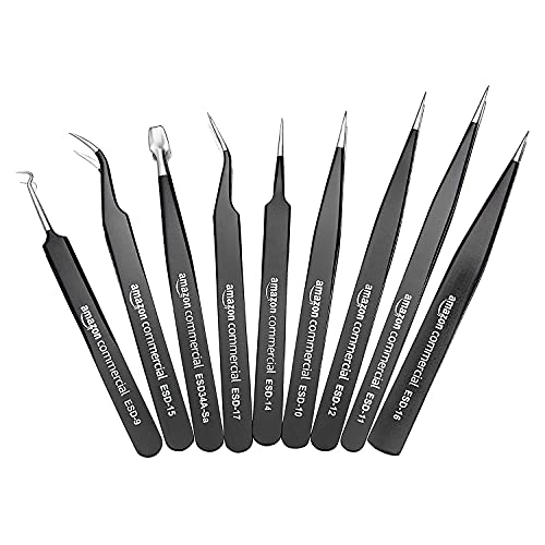 AmazonCommercial Set di pinzette in acciaio inossidabile, 9 pezzi, pinzette antistatiche ESD con punte non magnetiche