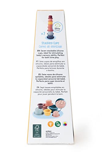Set di 7 coppe impilabili in silicone. Con una consistenza morbida e malleabile (soft touch e BPA Free), è un giocattolo ideale da usare durante il bagno.