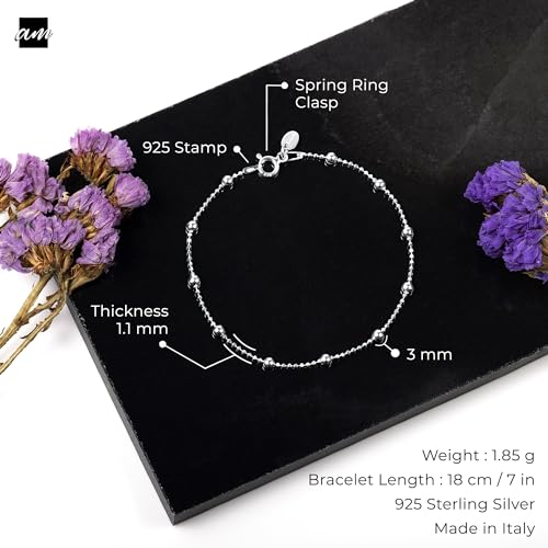 Amberta Bracciale da Donna in Argento Sterling 925 Lunghezza 18 cm: Maglia Sfere 1.1/3.2 mm