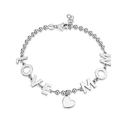 Amberta Gioielli - Bracciale in Argento Sterling 925 per Donna - Braccialetto Maglia Sfere 3 mm con Frase Mamma Ti Voglio Bene/Love Mom con Ciondolo Cuore - Lunghezza Regolabile da 18 a 20 cm