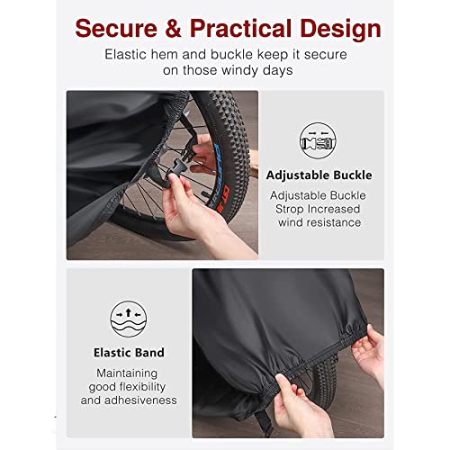 [Fibbie di sicurezza]: il nostro copribicicletta è molto leggero e ha grandi occhielli utili per fissarlo, rimane fermo grazie al fondo elasticizzato e ai connettori a scatto sulla cinghia di fissaggio. si adatta perfettamente sotto la ruota anteriore e posteriore della bicicletta.