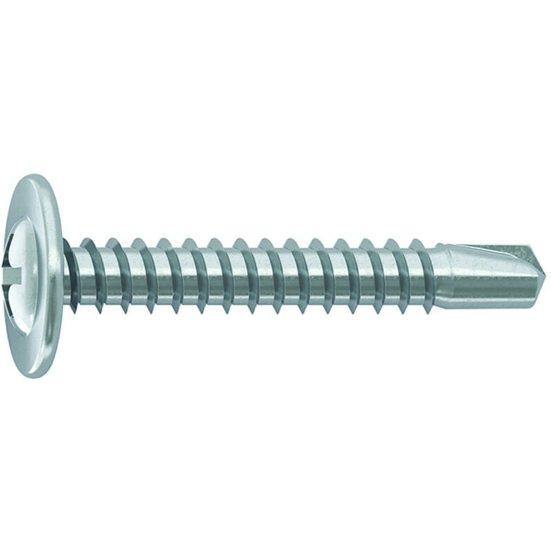 In acciaio zincata. Cava a croce PH. Con testa piatta e larga, è particolarmente indicata per il fissaggio di canaline elettriche, barre omega, pannelli sottili in legno o plastica su strutture metalliche, intelaiature di contropareti di cartongesso, carpenteria leggera, prefabbricati in lamiera.
