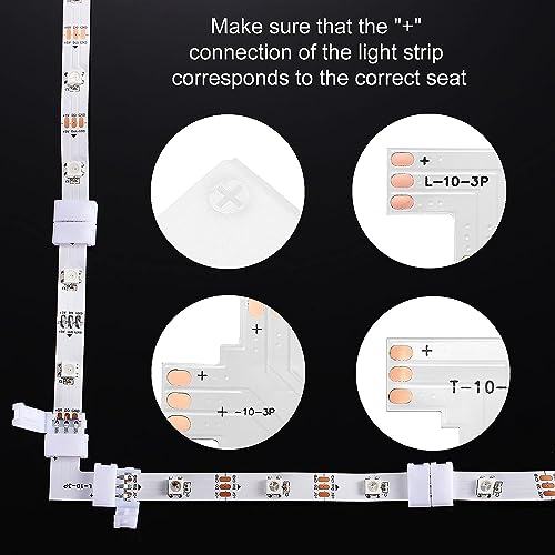 APPLICAZIONE: Kit di connettori rapidi LED 3pin 10mm adatto a luci di striscia LED SMD 5050 RGB larghe 10mm, che collegano strisce LED non impermeabili e impermeabili, ma hanno bisogno di staccare il rivestimento delle strisce LED impermeabili.