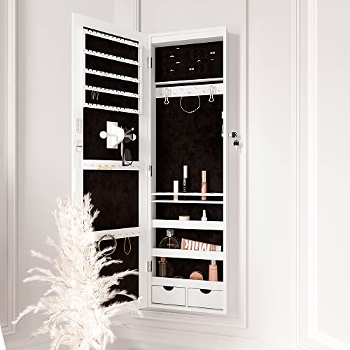Amelia Porta/Montato su La-Parete Lunghezza Totale Camera da Letto Mobile Specchio Gioielli con Luci LED Cassetti Scaffale con Serratura per Trucco/Cosmetici (Bianco)