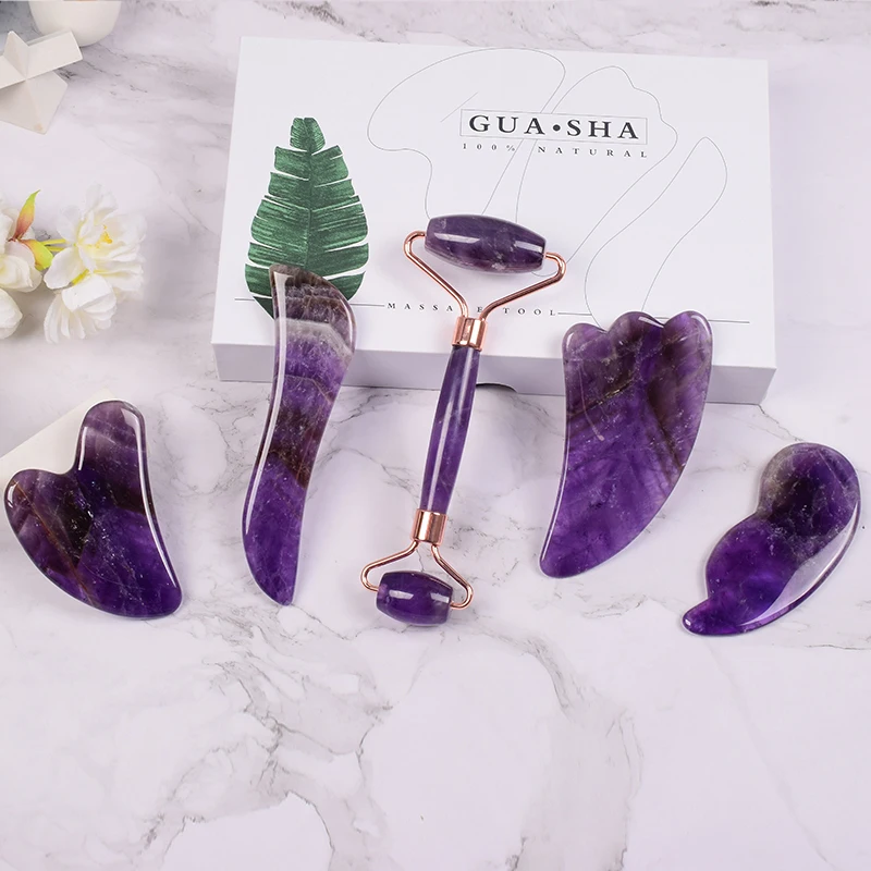 Amethyst Massager Natural Stone Facial Roller Gua Sha Tools Set SPA Acupuncture Scraping Crystal Body Face Health Care Massage