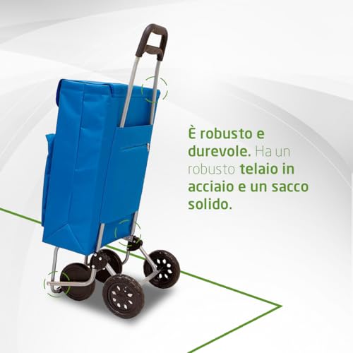 CARRELLO DELLA SPESA: Ha una capacità di 48 litri e una portata massima di 15kg, permettendoti di fare grandi spese senza preoccuparti del peso. Potrai andare al supermercato e uscire con la tua spesa in sicurezza. È un carrello della spesa resistente e duraturo grazie alla sua robusta struttura in acciaio e un solido sacco, garantendoti una lunga durata. Dimensioni: 22 x 40 x 106 cm. Colore: Blu