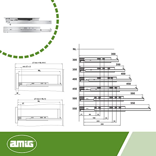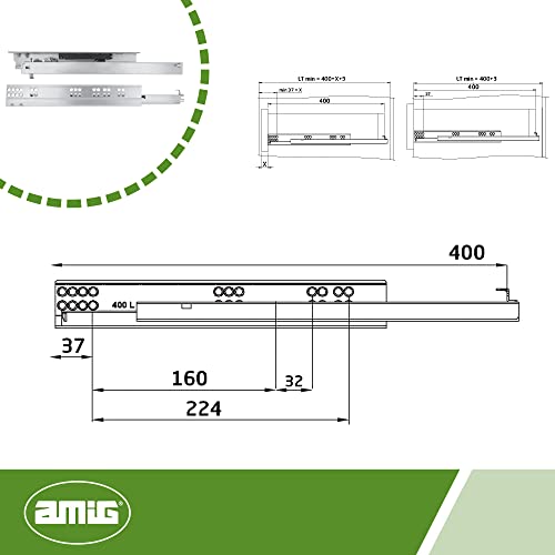 Amig - Set di 2 guide scorrevoli Mod.45 in acciaio zincato per mobili, cassettiere o armadi | Total Pull, chiusura automatica e apertura a spinta | Resistenza: 25 kg/coppia | Misure: 400 mm