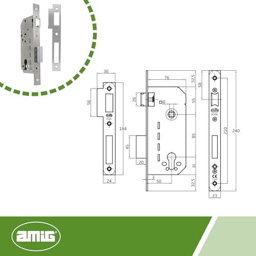 Dettagli: distanza tra maniglia e attacco cilindro: 85 mm. Ingresso: 50 mm Maniglia quadrata da 8 mm. Cassa chiusa e meccanismo interno in acciaio bicromato. Leva di chiusura in acciaio cromato. Scorrimento 20 mm (2 giri). Cilindro di sicurezza AMIG mod.9850 a 6 pin e pin antitrapano. Boccola mod.22 (ø 58 mm).