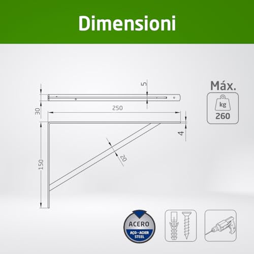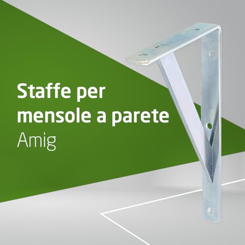 SUPPORTO PER SCAFFALATURE: Il supporto per scaffalature da muro di Amig è un prodotto versatile, resistente e facile da installare, che offre una soluzione pratica e duratura per l'installazione di scaffali in qualsiasi ambiente. Presenta un design funzionale e robusto che ti permetterà di montare scaffali in modo semplice e sicuro in qualsiasi spazio della tua casa o ufficio. Dimensioni: 250x150 mm.