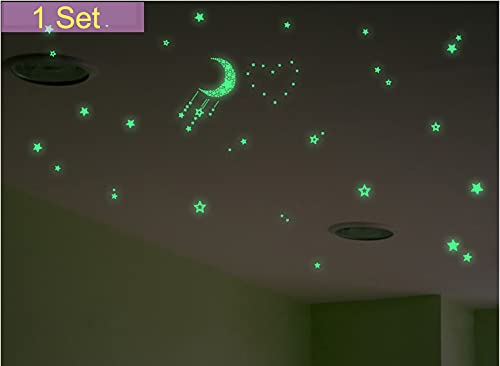 AMIGOGO Fluorescent Dots and Moon and Stars, Self-Adhesive Starry Sky, verde, 57 adesivi luminosi e decorativi, ideali per le stanze di Children's