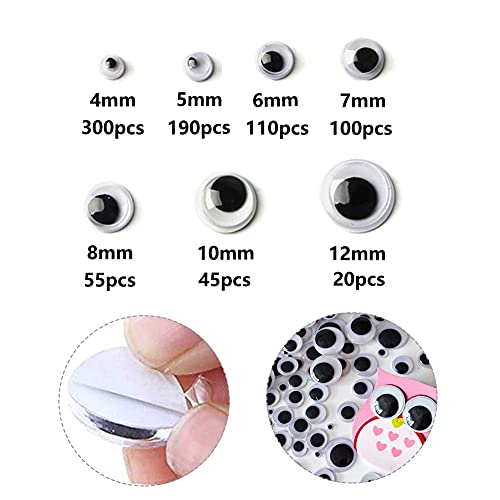 【DIMENSIONI MULTIPLE】:Googly Eyes hanno 7 tipi di diametri,inclusi 300 pezzi 4mm,190 pezzi 5mm,110 pezzi 6mm,100 pezzi 7mm,55 pezzi 8mm,45 pezzi 10mm,20 pezzi 12mm;