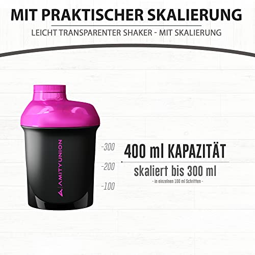AMITYUNION Protein Shaker Deluxe 400 ml a prova di perdite, senza BPA, con setaccio e scala - ORIGINALE - isolati di proteine e concentrati di BCAA, shaker per proteine, mixer fitness, nero
