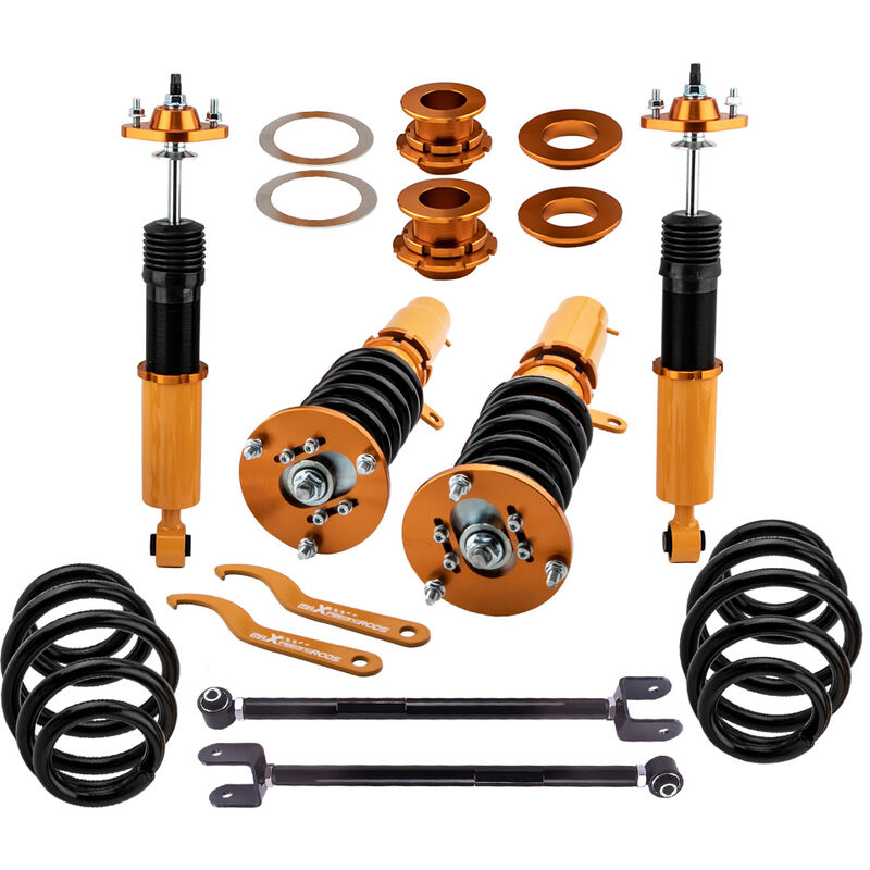 Applicazione For BMW 3 E46 4-door sedan/Saloon 320i 325i 328i 330i 318d 320d 330d 02/1998-04/2005 For BMW 3 E46 2-door Convertible 323ci 325ci 330ci 320cd 330cd 04/2000-12/2007 For BMW 3 E46 2-door Coupe 320ci 325ci 330ci 320cd 330cd 02/1999-12/2006 For BMW 3 E46 Touring 5-door Wagon/Estate 316i 323i 325i 328i 330i 318d 320d 330d 10/1999-05/2005 Note: not for Xi/xd 4 wheel drive Note: shoter swaybar end link required. Indicazioni Quantità: un set Coilover (2 anteriore + 2 posteriori) Braccio di controllo camber posteriore a una coppia Supporti superiori: supporto superiore a sfera del cuscino anteriore con piastra camber supporti posteriori pillow ball top Velocità molla anteriore: 8 kg / mm (448 libbre / in) Velocità molla posteriore: 7 kg / mm (392 libbre / in) Colore: Dorato Ammortizzatore: forza dell'ammortizzatore non regolabile Altezza regolabile: SÌ, abbassamento da 1 '' a 3 '' Tipo di shock: doppio tubo Precarico molla: 7-10 mm Piastra camber regolabile: SI Garanzia: 2 anni di