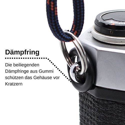 Facile montaggio: i ganci in acciaio consentono una facile applicazione su quasi tutti i tipi di fotocamera (soprattutto fotocamere reflex) e occhielli tondi (DSLR, SLR, DSLM, ecc.). La tracolla della fotocamera è adatta per fotocamere analogiche e digitali dei produttori Canon, Nikon, Sony, Fujifilm, Pentax, Panasonic, Olympus o Minolta.