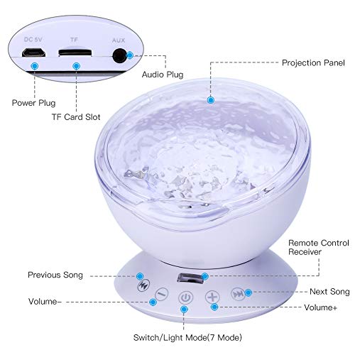✔ Lettore musicale integrato & 4 ninnananna Musica: facile da connettere con dispositivi come iPod, cellulare, lettore MP3 o inserire una scheda TF per riprodurre la tua musica preferita. Dispone inoltre di 4 brani di ipnosi integrati, suoni di insetti della foresta, gabbiani delle onde dell'oceano suoni, suoni fluenti degli uccelli acquatici e allegri suoni della natura, creano un'atmosfera confortevole.
