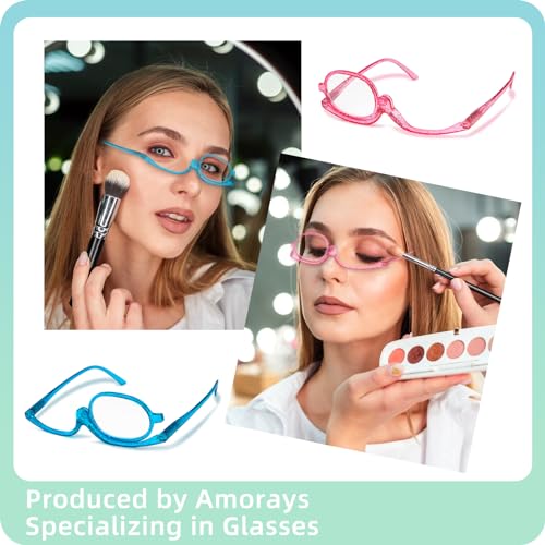 Amorays 2 Pacco Occhiali per Truccarsi Donna,Occhiali da Lettura rotanti per strumento Monolente per Trucco Moda LF3660(Barbie blu&rosa,+3.00)