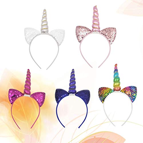 Amosfun - Cerchietto per capelli con orecchie da gatto e unicorno, con lustrini, 5 pezzi