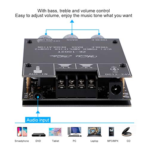 HiFi e stereo: scheda amplificatore di alta qualità a 2 canali 100 Wx2 per musica HIFI. Con AUX e Bluetooth due metodi di ingresso audio, versione Bluetooth 2 in 1, l'efficienza di trasmissione è superiore, la distanza di trasmissione è più lontana. Con un filtro induttore il suono è rotondo e chiaro
