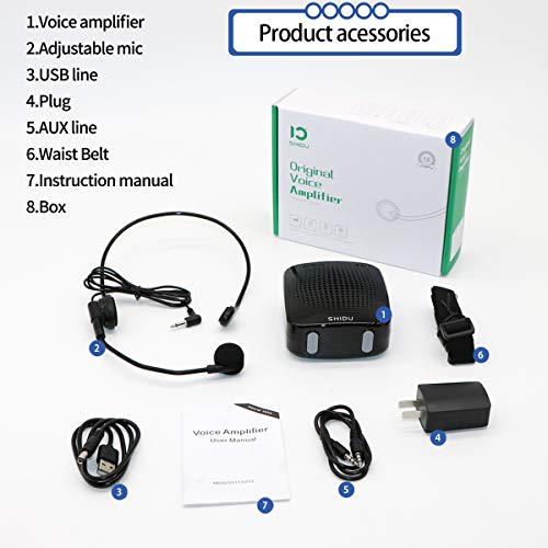 mini amplificatore portatile: questo amplificatore è molto mini, quindi puoi portarlo con te senza alcun peso.La confezione include : Amplificatore vocale * 1, microfono cablato Auricolare * 1, cintura regolabile * 1, Caricabatterie * 1 , Linea USB * 1, linea AUX * 1, Manuale * 1.