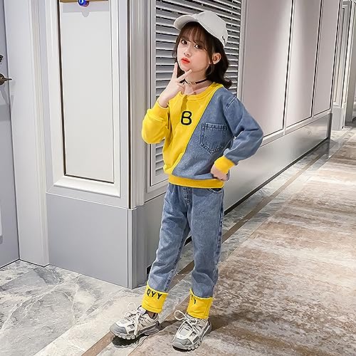 Amropi 2 PCS Set Completo Ragazze Felpa + Denim Pantaloni Jogging Tuta Sportiva Giallo Blu,3-4 Anni