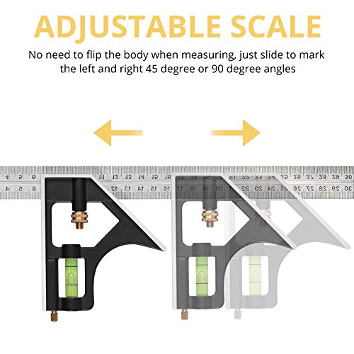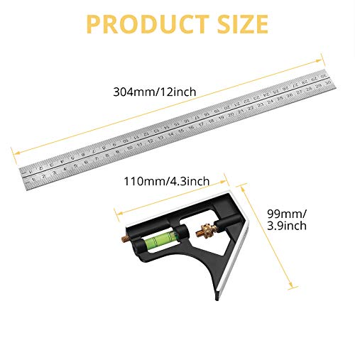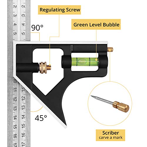 Squadretta Combinata: La Lama In Acciaio Inossidabile Da 12 Pollici Ha Una Sfumatura Nera Incisa Con Precisione e Include Raccordi In Ottone. Strumenti Multifunzionali: Squadra, Profondimetro, Altimetro, Livello a Piombo, Scriba e Livello. Fiala Acrilica Resistente Agli Urti Con Manico. Il Bullone a Molla Fissa La Lama Nella Posizione Corretta Per Ottenere Un'Impostazione Stabile e Precisa. Il Resistente Corpo In Zinco Pressofuso è Durevole.