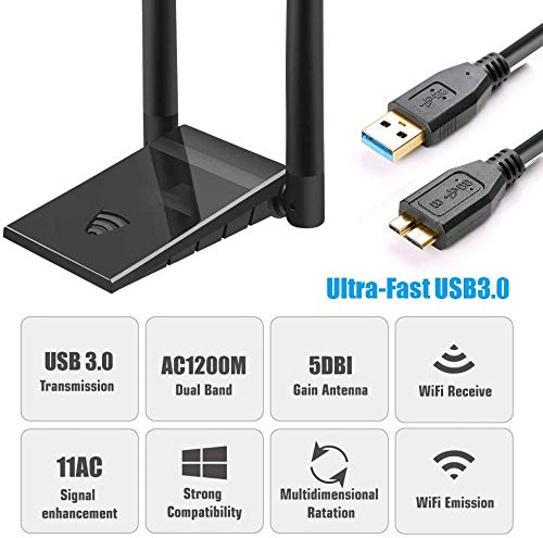 【Tecnologia Dual Band】: USB 1200Mbps WiFi velocità a 5 GHz (867Mbps) o 2,4 GHz (300 Mbps). 5DBI Antenna con la funzione Gain, per aumentare la capacità di ricezione del segnale da più lontano, rendere stabile il segnale wifi.