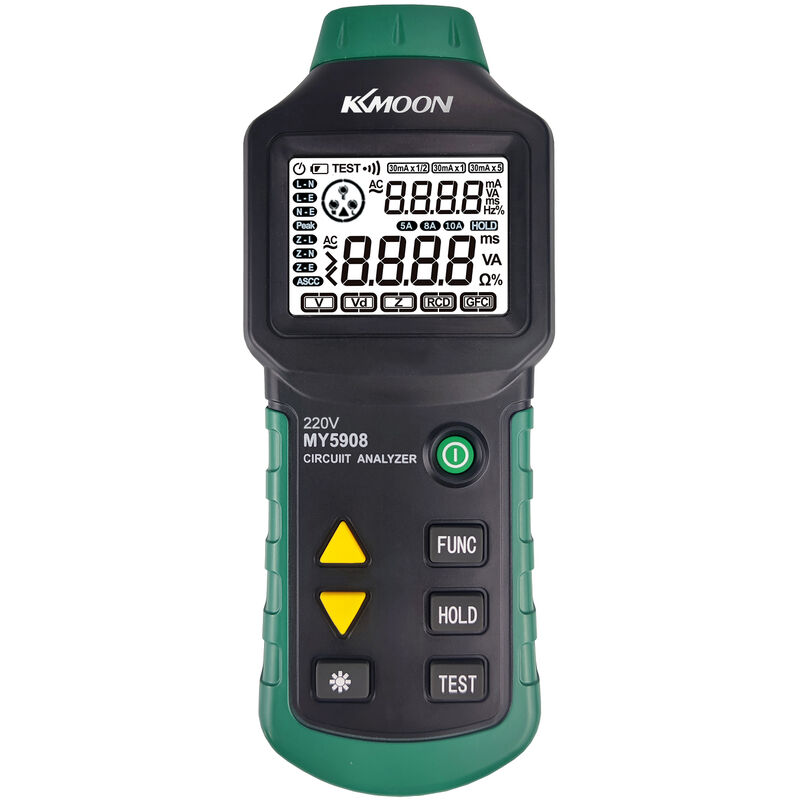 Questo analizzatore di circuiti è un dispositivo di test speciale progettato per la localizzazione rapida dei guasti della linea di distribuzione CA a bassa tensione, con un funzionamento semplice, misurazioni accurate e altre caratteristiche, è in grado di rilevare più problemi su una linea, come scosse elettriche, incendi elettrici, anomalie funzionamento di apparecchiature, ecc. Caratteristiche: Vero valore efficace che misura la tensione CA. Carico artificiale 5A, 8A, 10A caduta della linea di misura. Misurare la tensione di fase, la tensione di linea del neutro (linea zero) verso terra, la tensione di picco, la frequenza. Fase di misura (linea sotto tensione), linea neutra (linea zero), impedenza del conduttore di terra. Identificazione della modalità di connessione della presa a 3 fili (zero per sinistra e live per destra, indipendentemente dal fatto che sia presente o meno la linea dell'arcata). Verifica dell'affidabilità del dispositivo a corrente residua (RCD), dell'azione