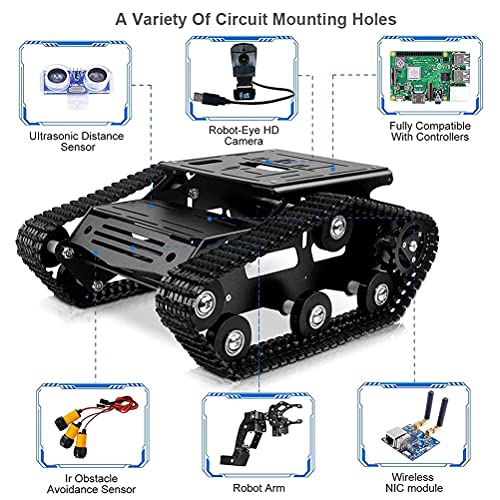 ◆【Funzioni più interessanti】 Tank Mobile Platform è completamente compatibile con i controller più popolari sul mercato come Jetson Nano, Raspberry Pi, UNO R3, Mega 2560 e così via. Gli utenti possono aggiungere vari sensori, servi, giradischi e controller con più fori di montaggio sulla piattaforma del robot