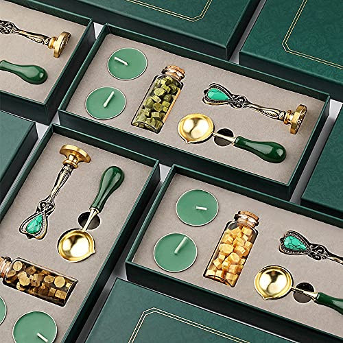 [La confezione include] Il kit di timbri a cera Anbose include 1 manico in lega di zinco, 1 testa in ottone volpe, 1 cucchiaio di fusione, 2 candele verdi, 1 bottiglia di perline di cera di tenuta (circa 60 pezzi in oro), 1 confezione regalo squisita.