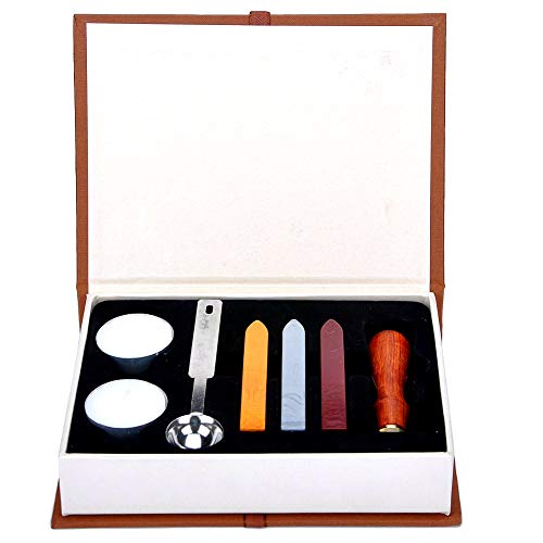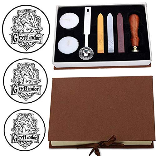 ANBOSE - Set di timbro per ceralacca a tema scuola di magia, con 1 manico in legno con guarnizione in rame, 3 bastoncini di cera, 1 cucchiaio per fusione e 2 candele tea light bianche