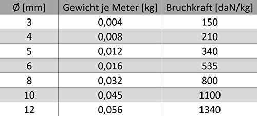 Attenzione: ! La quantità ordinata verrà consegnata non tagliata in un unico pezzo. Lunghezza massima al pezzo: 3 mm/350 m, 4 mm/300 m, 5 mm/280 m, 6 mm/270 m, 8 mm/240 m, 10 mm/260 m, 12 mm/180 m