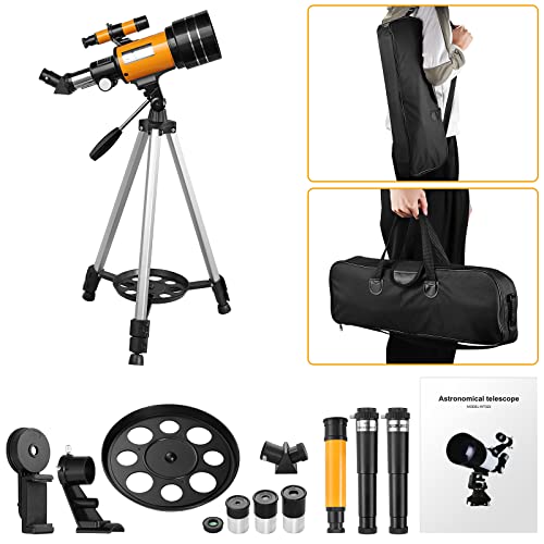 【Qualità ottica superiore】 Dispone di una grande apertura di 70 mm e di una lunghezza focale di 300 mm, questo telescopio astronomico fornisce immagini più nitide e luminose. La lente in vetro ottico completamente rivestita con elevata trasmissione della luce aumenta la luminosità e la chiarezza delle immagini.