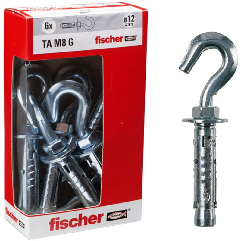 Fischer ta m g yancorante multiuso con gancio ta m-g y in scatola di cartone con finestramateriali di supporto: approvato per: b calcestruzzo da c20/25 a c50/60, non fessurato adatto anche per: b calcestruzzo c12/15 pietra naturale con struttura compattavantaggi: b la geometrica ottimizzata minimizza lo sforzo per l'installazione e ne permette l'utilizzo in spazi estremamente ristretti, questo consente una facile installazione per utilizzatori, il corpo a tre settori espandenti provoca una distribuzione uniforme del carico e quindi interassi e distanze dal bordo ridotti, questo rende il ta m estremamente flessibile, la filettatura metrica interna consente l'utilizzo di viti e barre filettate standard per un'ideale adattamento applicazione, il tappo in plastica rosso protegge la filettatura dalla polvere di foratura, assicurando così un corretto funzionamento, il ta m (solo ancorante o con vite) è disponibile anche in acciaio inossidabile a2 (non certificata), i set di fissaggio con