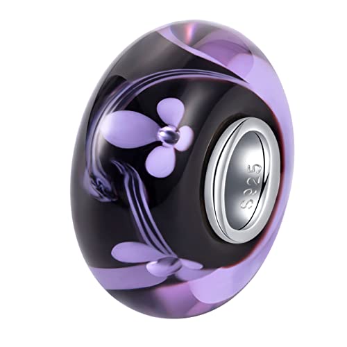 Andante-Stones Argento massiccio 925 originale vetro di Murano Perlina Bead color nera con fiori porpora e lila Ciondolo da donna Charm per bracciali europei + sacchetto di organza