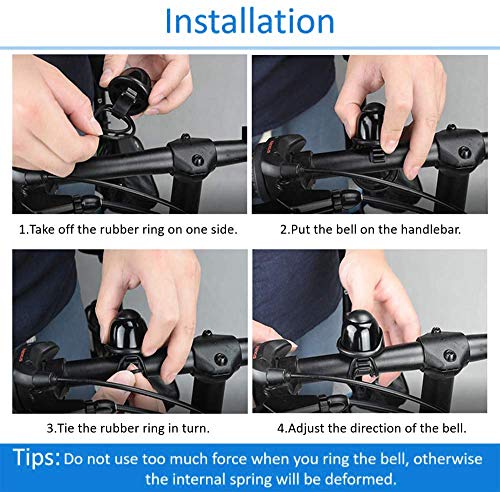 Facile installazione: È molto facile per voi installare questo campanello regolabile per bicicletta. Tutto quello che dovete fare è scegliere una posizione adatta sul manubrio e legare a turno l'anello di gomma per fissare la base della campana. Comodo e fa risparmiare tempo