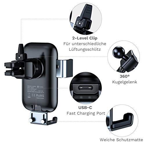 Andobil - Supporto da Auto per iPhone 11/11 PRO/Samsung Galaxy Note 10/S10, con Morsetto Automatico Qi 7,5 W/10 W