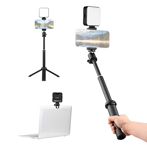 Andoer Kit illuminazione per video a LED RGB CRI95+ 2500K-9000K dimmerabile, 20 effetti di luce, retro magnetico con supporto da tavolo + testa sferica flessibile + supporto per cellulare