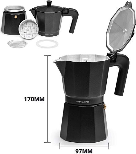 Andrew James - Caffettiera moka, con guarnizione in silicone di ricambio, manico a isolamento termico e coperchio ribaltabile, alluminio, Nero, 6 tazze