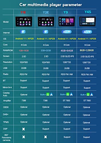 [Caratteristiche] Questa autoradio supporta la navigazione GPS/FM AM autoradio/lettore multimediale/lettore musicale/AV-OUT/chiamate vivavoce Bluetooth/controllo del volante/Mirror Link/Park Assist/navigazione Web/comunicazione online/DSP (Y3, Y4)/RDS(Y3,Y4)/videocamera DVR(opzionale), OBD2(opzionale), DAB(opzionale), Carplay (Y3,Y4), TPMS(opzionale).