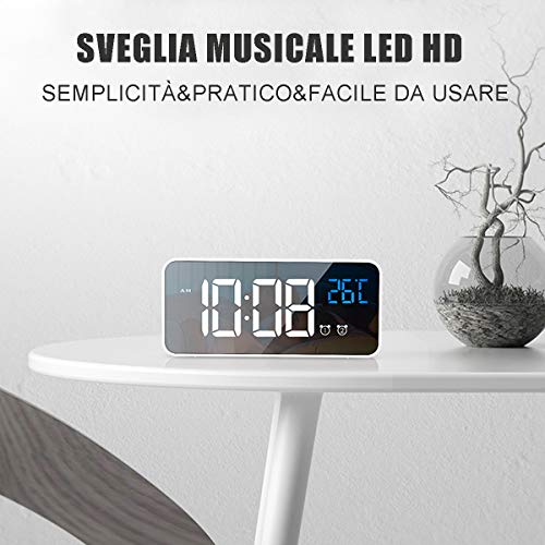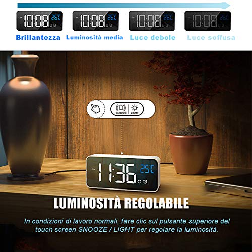 AndThere Sveglia Digitale da Comodino Sveglia Digitale LED con 2 Allarme Funzione Snooze Temperatura Orologio a Specchio Sveglia Digitale Ricarica USB Luminosità Regolabile Sveglia Tavolo Bambini