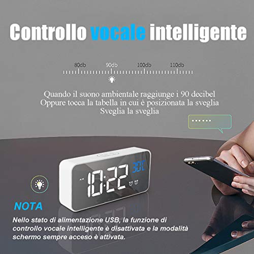 【Controllo Audio】 La sveglia digitale da comodino ha 4 opzioni di luminosità e può essere controllata dal suono. Basta emettere un leggero suono o toccare l'orologio digitale per riattivare lo schermo. Dopo 6 secondi, lo schermo si spegnerà senza alcuna operazione. Il display dello schermo rimane acceso quando è connesso.