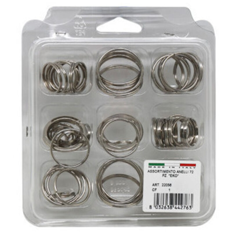 In acciaio. Confezione da 72 pezzi contenente anelli in varie dimensioni Anelli Ø35 mm. - 5 PEZZI Anelli Ø30 mm. - 10 PEZZI Anelli Ø25 mm. - 16 PEZZI Anelli Ø20mm. - 18 PEZZI Anelli Ø12 mm. - 12 PEZZI Anelli Ø16 mm. - 11 PEZZI