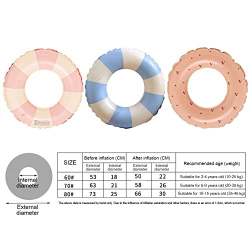 【Dimensione anello galleggiante】#60: adatto per 2-4 anni, diametro esterno 53-55 cm, diametro interno 18 cm, capacità di carico 10-25 kg. #70: adatto per 5-9 anni, diametro esterno 63-65 cm, diametro interno 21 cm, capacità di carico 20-35 kg. #80: adatto per 10-15 anni, diametro esterno 73-75 cm, diametro interno 25 cm, capacità di carico 35-45 kg. Ideale per feste in piscina e sport.