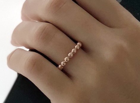 Questo anello è realizzato in sfere in puro argento sterling 925, è estendibile ed impreziosito da una calda doratura rosé.Gli orecchini sono larghi 3 mm.