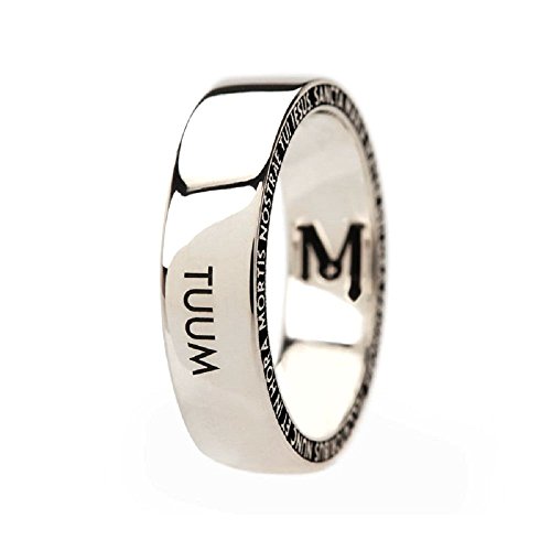 Anello TUUM NUOVO con garanzia originale TUUM, collezione Numero Uno, in argento rodiato lucidato a specchio, il testo della preghiera Ave Maria in latino è posto sullo spessore dell' anello. All'interno infine, l'iconica capolettera M ne identifica la preghiera. Taglia 21 Larghezza della fascia 6,0mm