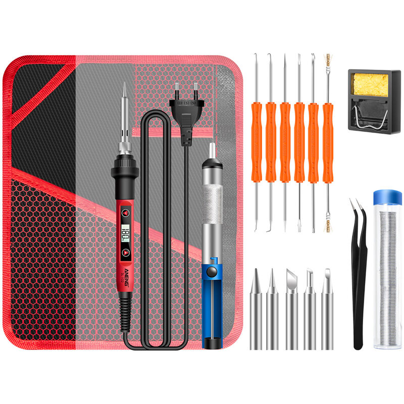 Con caratteristiche portatili e sostituibili con la punta, questo set di saldatori elettrici compatto e leggero è pratico e comodo da usare. Con una comoda maniglia di controllo e una semplice interfaccia di controllo, può effettivamente migliorare l'efficienza operativa, che può essere uno strumento perfetto per ingegneri elettronici e appassionati di manutenzione elettronica. Caratteristiche: Kit saldatore da 16 pezzi che include un saldatore elettrico, un multimetro digitale, un supporto per saldatore, un estrattore di stagno, una termocoppia, una matita di prova, 2 linee di prova del multimetro, un filo di stagno, una copertura protettiva in silicone per punta di saldatura, punte di saldatura 5 pezzi, e una custodia. Kit saldatore da 17 pezzi che include un saldatore elettrico, una pinzetta antistatica, uno strumento ausiliario dissaldante 6 pezzi, un supporto per saldatore, un estrattore di stagno, un filo di stagno, punte di saldatura 5 pezzi e una custodia. Kit saldatore da 25