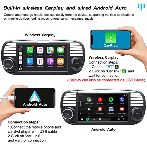 AneQu Autoradio Android per Fiat 500 2007-2016 con Android 12 Octa Core 4 GB RAM 64 GB ROM Navigatore GPS per auto singolo Din con telecamera di retromarcia Carplay integrato Android Auto Nero