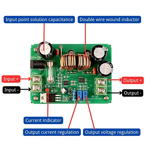 Tensione in entrata: 12-60 V. Corrente in ingresso: Corrente di ingresso massima di 15A. Tensione di uscita: da 12 a 90 V, regolabile.
